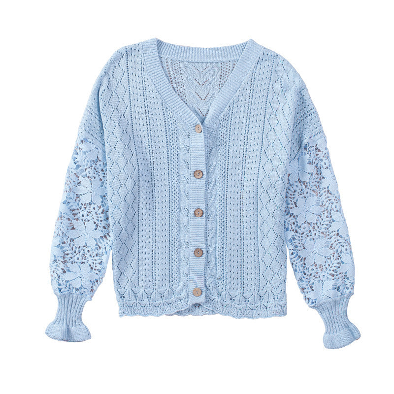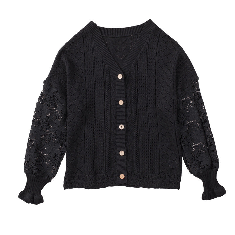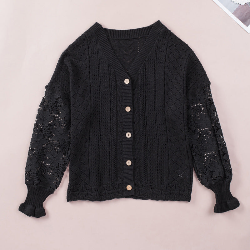 Confectionné dans une maille ajourée légère, ce cardigan se distingue par ses manches ornées de dentelle florale raffinée. Les boutons en bois ajoutent une touche naturelle et élégante qui sublime l’ensemble.